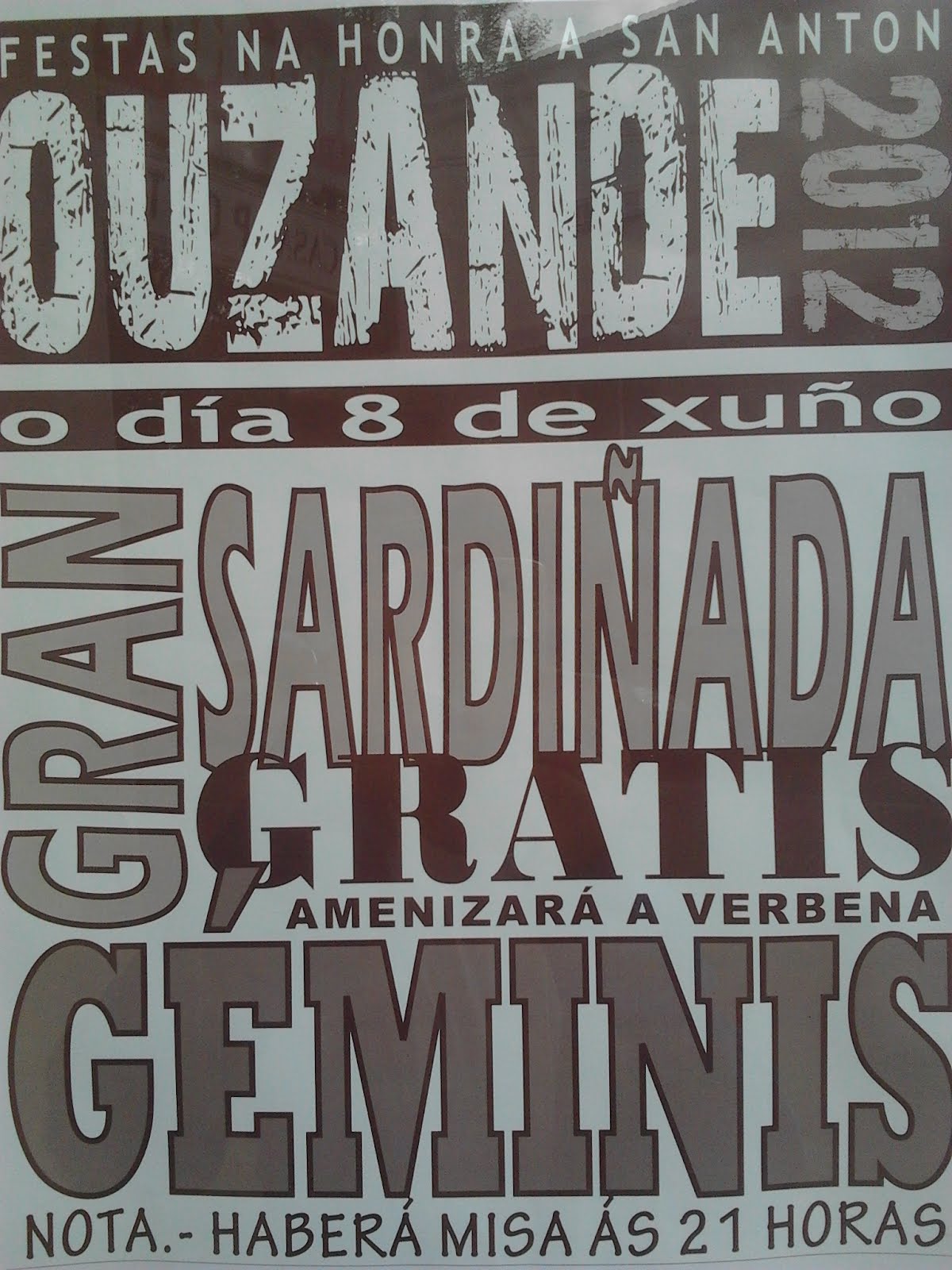 A Xunta Parroquial vén de distribuir a cartelería para anunciar a festa de Santo Antonio, que se vai celebrar este venres día 8 de xuño no Campo da Festa de Ouzande. A actividade comezará cos actos relixiosos na honra do santo protector dos animais ás 21:00h. Posteriormente e xa no Campo de Baile haberá unha gran sardiñada gratuíta e a actuación do DÚO GÉMINIS. Á unha da madrugada, a comisión de festas, sorteará un cabritiño entre as persoas que mercaran rifas para axudar a sufragar os gastos da organización.